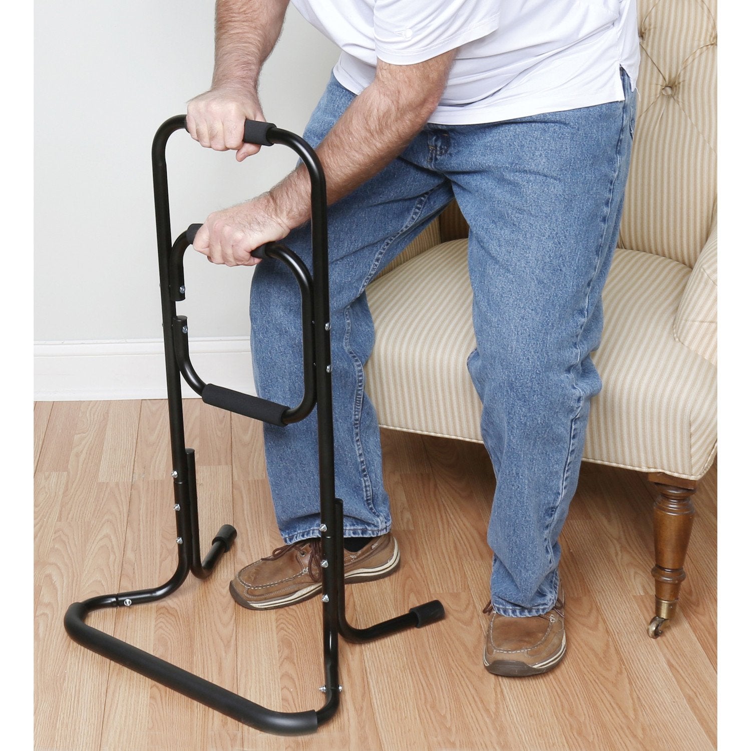 - GET HELP RISING FROM ANY POSITION - Stand rail features 3 padded hand holds to help with rising from different seated positions - and even help rising from the floor or picking up dropped items.